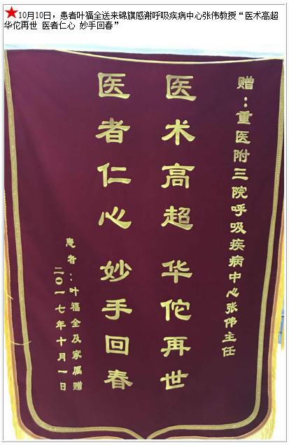 患者叶福全送来锦旗感谢呼吸疾病中心张伟教授