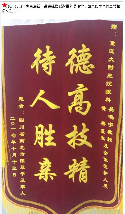 患者陈翠平送来锦旗感谢眼科吴鸣宇、黄果医生