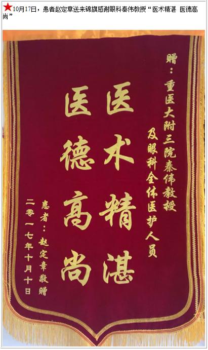患者赵定章送来锦旗感谢眼科秦伟教授