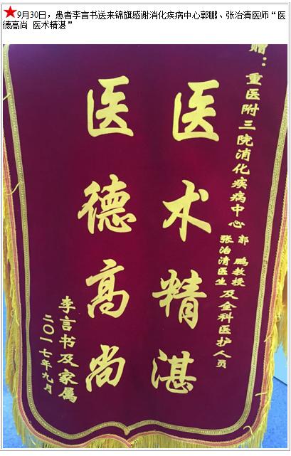 患者李言书送来锦旗感谢消化疾病中心郭鹏、张治清医师