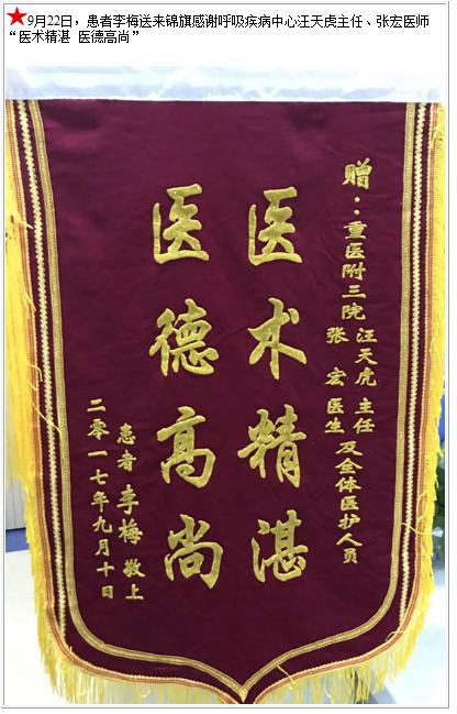 患者李梅送来锦旗感谢呼吸疾病中心汪天虎主任、张宏医师