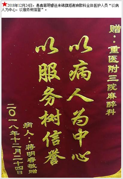 患者蒋明睿送来锦旗感谢麻醉科全体医护人员