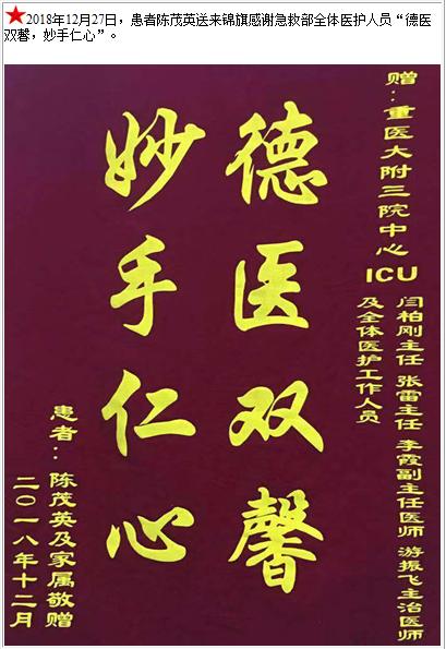 患者陈茂英送来锦旗感谢急救部全体医护人员