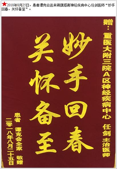 患者谭克会送来锦旗感谢神经疾病中心任剑医师