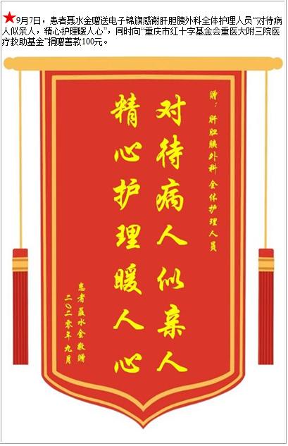患者聂水金赠送电子锦旗感谢肝胆胰外科全体护理人员,并向医疗救助基金捐赠善款100元