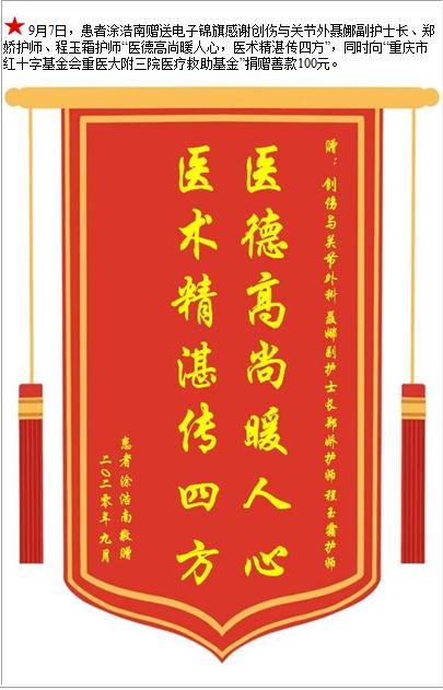 患者涂浩南赠送电子锦旗感谢创伤与关节外聂娜副护士长等人,并向医疗救助基金捐赠善款100元