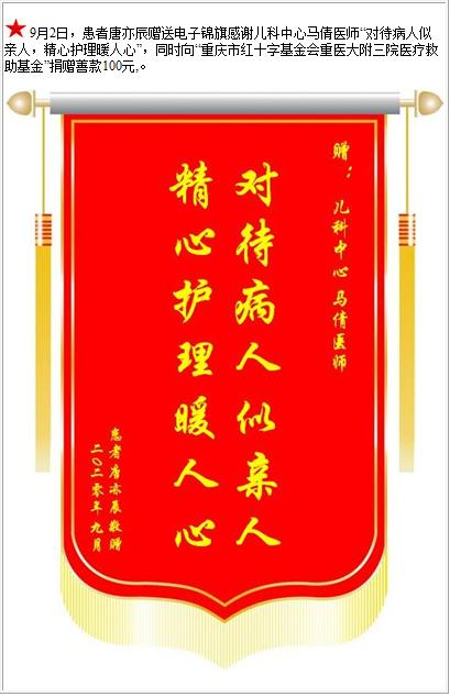 患者唐亦辰赠送电子锦旗感谢儿科中心马倩医师,并向医疗救助基金捐赠善款100元