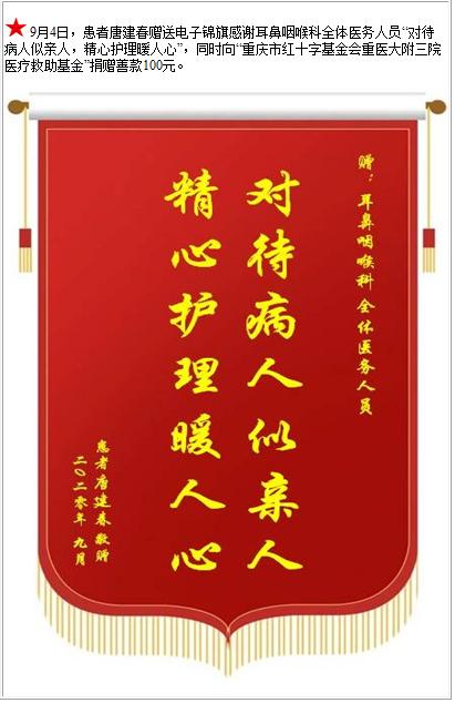 患者唐建春赠送电子锦旗感谢耳鼻咽喉科全体医务人员,并向医疗救助基金捐赠善款100元