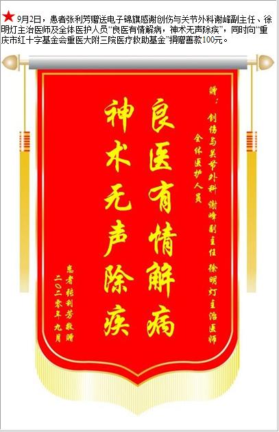 患者张利芳赠送电子锦旗感谢创伤与关节外科谢峰副主任等人及全体医护人员,并向医疗救助基金捐赠善款100元