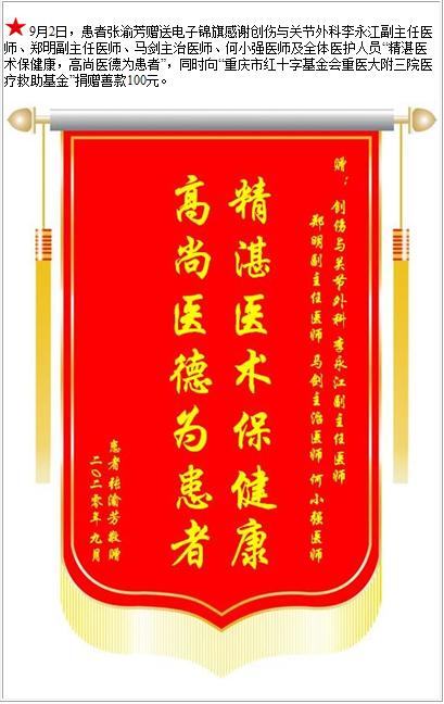 患者张渝芳赠送电子锦旗感谢创伤与关节外科李永江副主任医师等人及全体医护人员,并向医疗救助基金捐赠善款100元
