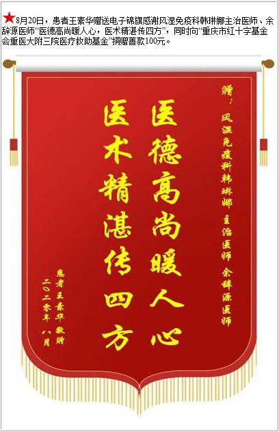 患者王素华赠送电子锦旗感谢风湿免疫科韩琳娜主治医师等人,并向医疗救助基金捐赠善款100元