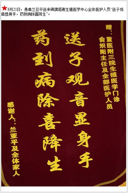 患者兰亚平送来锦旗感谢生殖医学中心全体医护人员“送子观音显身手,药到病除喜降生”