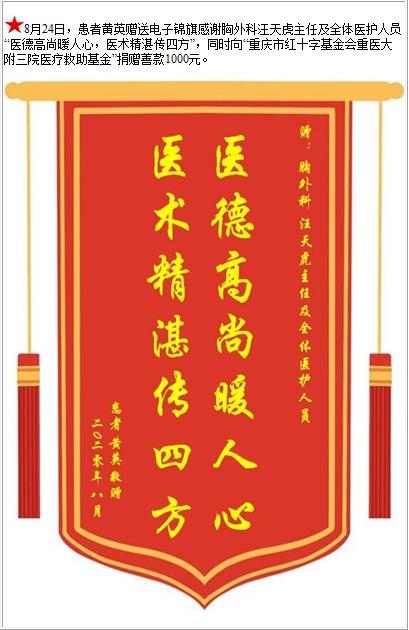 患者黄英赠送电子锦旗感谢胸外科汪天虎主任及全体医护人员,并向医疗救助基金捐赠善款1000元
