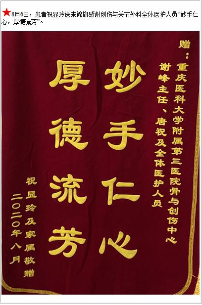 患者祝显玲送来锦旗感谢创伤与关节外科全体医护人员“妙手仁心,厚德流芳”