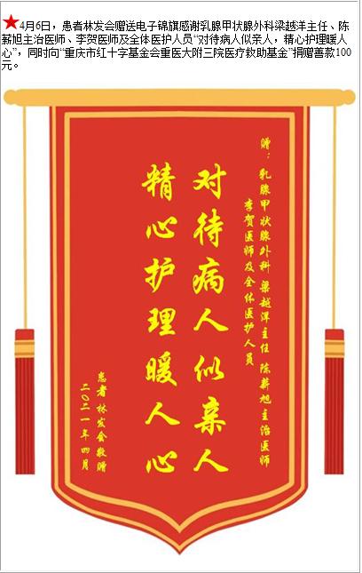 患者林发会赠送电子锦旗感谢乳腺甲状腺外科梁越洋主任等人及全体医护人员,并向医疗救助基金捐赠善款100元