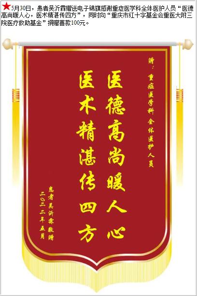 患者吴沂霖赠送电子锦旗感谢重症医学科全体医护人员,并向医疗救助基金捐赠善款100元