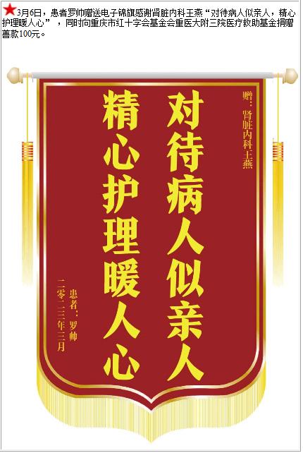患者罗帅赠送电子锦旗感谢肾脏内科王燕,并向医疗救助基金捐赠善款100元