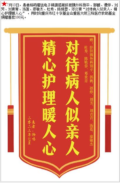 患者杨鸣赠送电子锦旗感谢肝胆胰外科别平等人 ,并向医疗救助基金捐赠善款100元