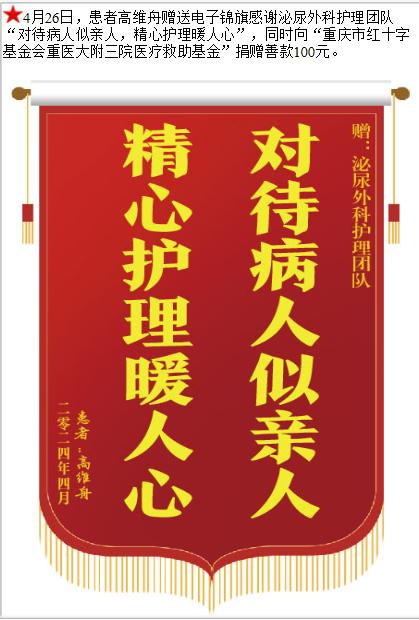 患者高维舟赠送电子锦旗感谢泌尿外科护理团队,并向医疗救助基金捐赠善款100元。
