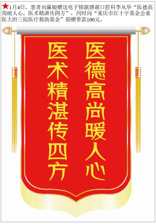患者刘赢银赠送电子锦旗感谢口腔科李丛华,并向医疗救助基金捐赠善款100元。