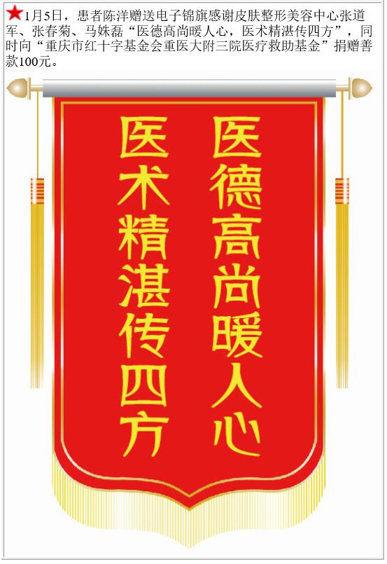 患者陈洋赠送电子锦旗感谢皮肤整形美容中心张道军等,并向医疗救助基金捐赠善款100元。