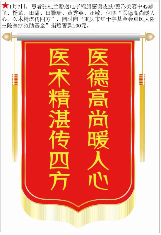 患者张桂兰赠送电子锦旗感谢皮肤/整形美容中心郝飞等,并向医疗救助基金捐赠善款100元。