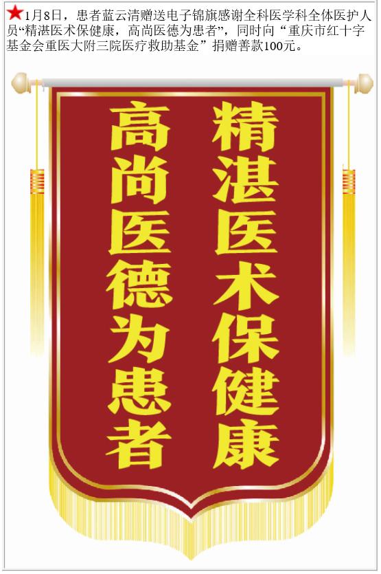 患者蓝云清赠送电子锦旗感谢全科医学科全体医护人员,并向医疗救助基金捐赠善款100元。