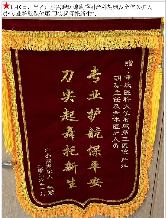 患者卢小露赠送锦旗感谢产科胡珊等。