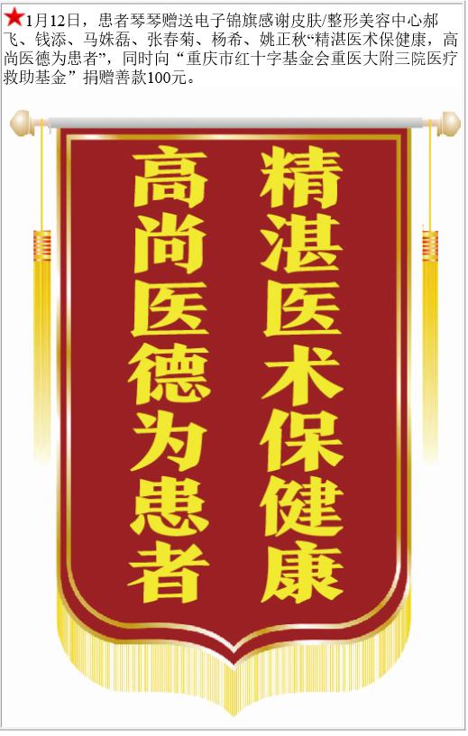 患者琴琴赠送电子锦旗感谢皮肤/整形美容中心郝飞等,并向医疗救助基金捐赠善款100元。