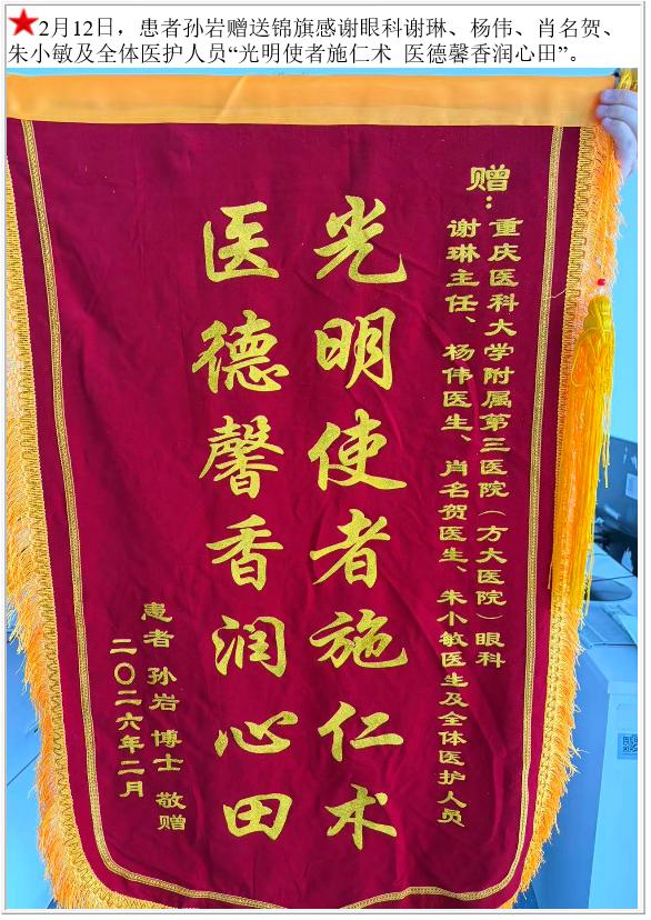 患者孙岩赠送锦旗感谢眼科谢琳等。