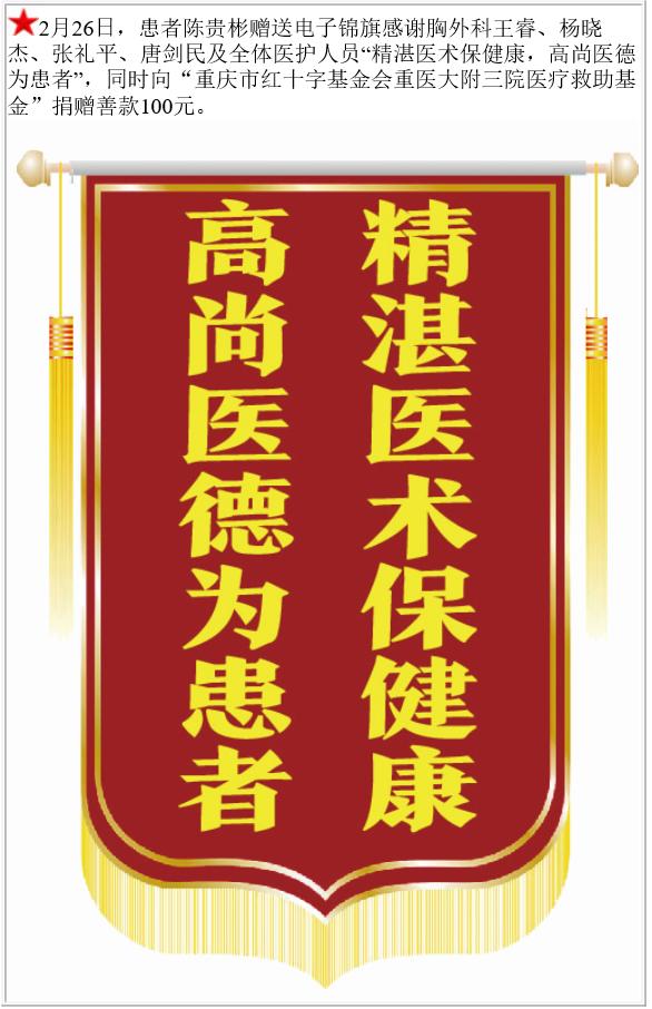 患者陈贵彬赠送电子锦旗感谢胸外科王睿等,并向医疗救助基金捐赠善款100元。