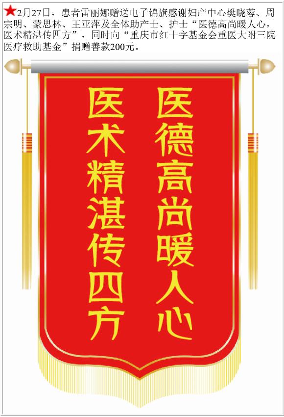 患者雷丽娜赠送电子锦旗感谢妇产中心樊晓蓉等,并向医疗救助基金捐赠善款200元。