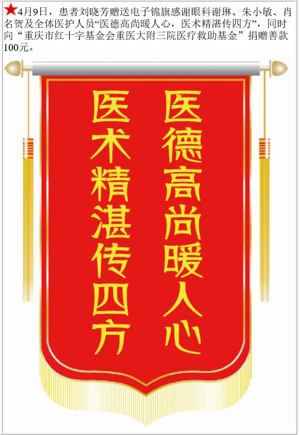 患者刘晓芳赠送电子锦旗感谢眼科谢琳等,并向医疗救助基金捐赠善款100元。