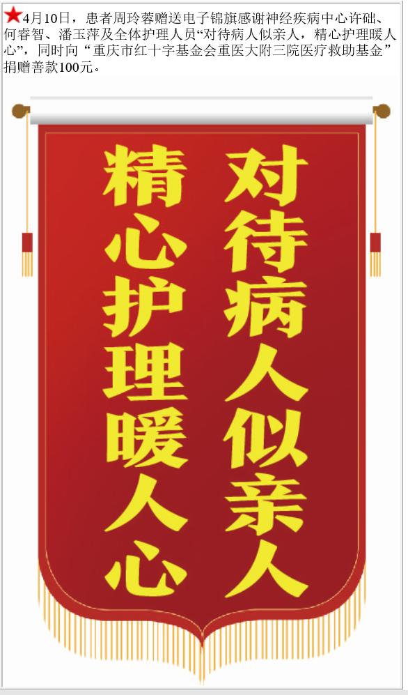 患者周玲蓉赠送电子锦旗感谢神经疾病中心许础等,并向医疗救助基金捐赠善款100元。