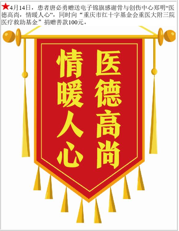 患者唐必勇赠送电子锦旗感谢骨与创伤中心郑明,并向医疗救助基金捐赠善款100元。