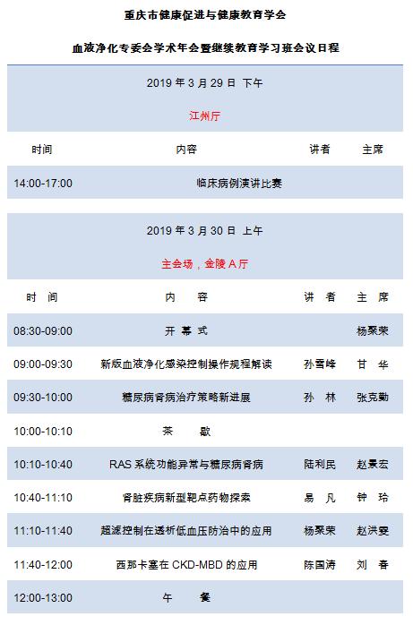 重庆市健康促进与健康教育学会血液净化专委会学术年会暨继续教育学习班将于2019年3月29日-30日在重庆渝北区金陵大饭店召开。本次学术会议由重庆市健康促进与健康教育学会、重庆医科大学附属第三医院(捷尔医院)联合举办。会议以“血液净化及肾脏病理诊断新进展”为主题,旨在提高我市血液净化及肾脏病理诊断与治疗水平,会议将邀请到国内知名肾脏病专家作学术讲座。现将会议有关事宜通知如下:
